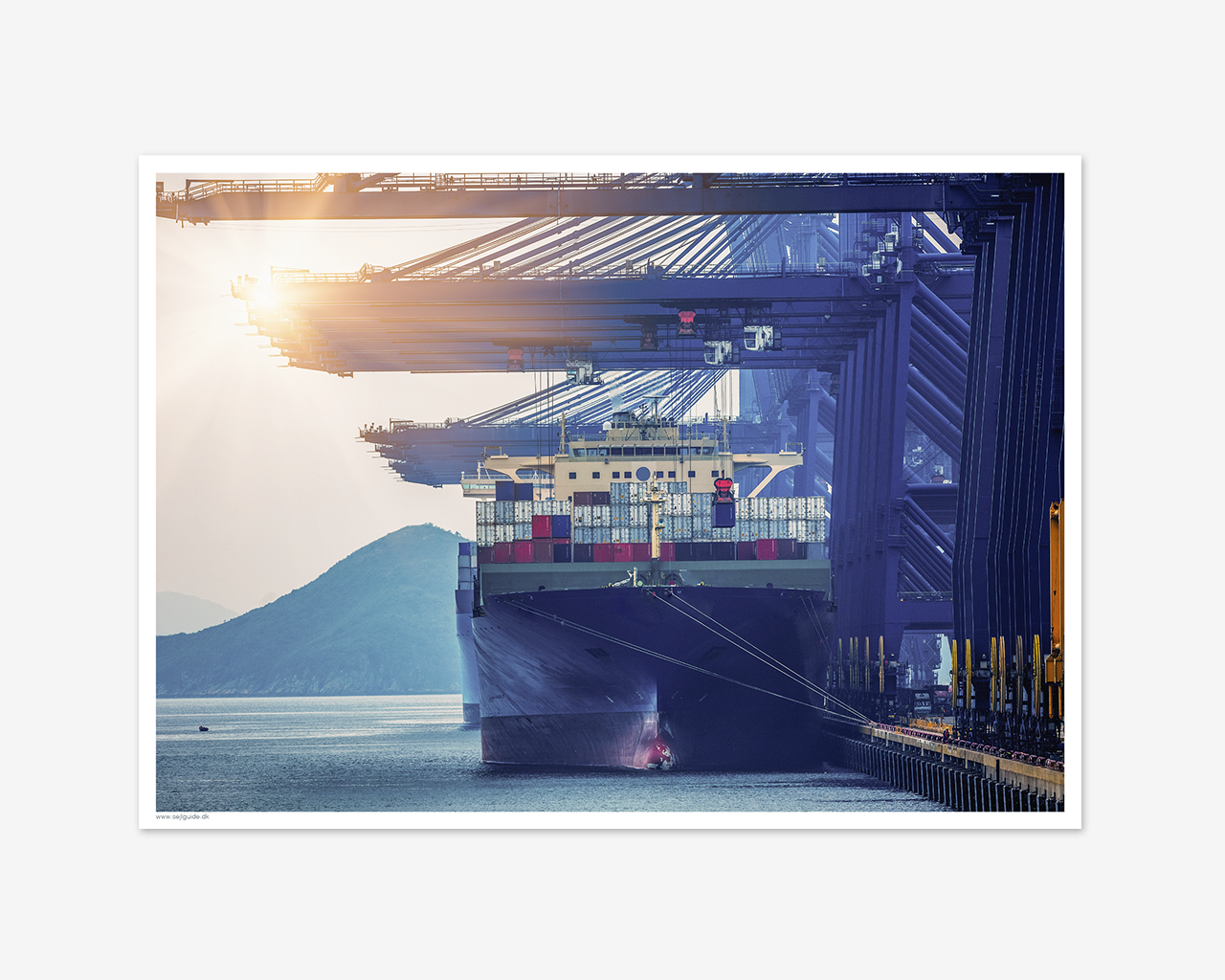 Containerskib i havnen ved solnedgang