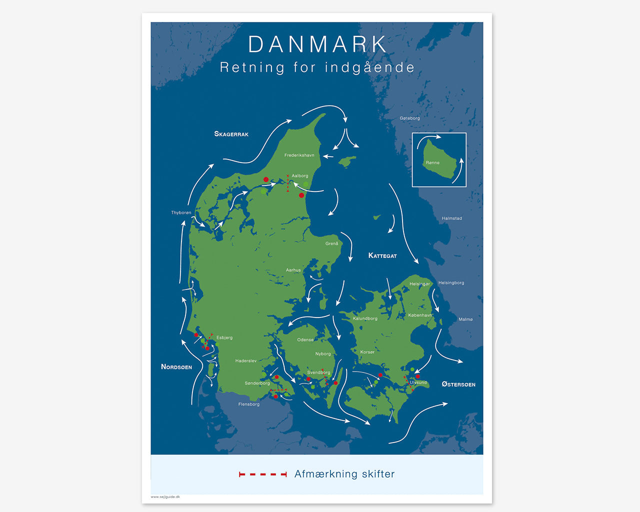 Denne plakat viser de fem steder i danmark, hvor man skal være særligt opmærksom på at retningen for indgående skifter. Dette er vigtigt for at kunne afkode bøjerne korrekt.