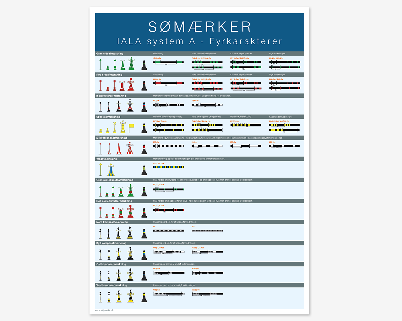 Plakaten viser en oversigt over de farvandsafmærkninger (sømærker, bøjer), der bruges i de danske farvande. Denne udgave er udvidet med fyrkaraktererne.
